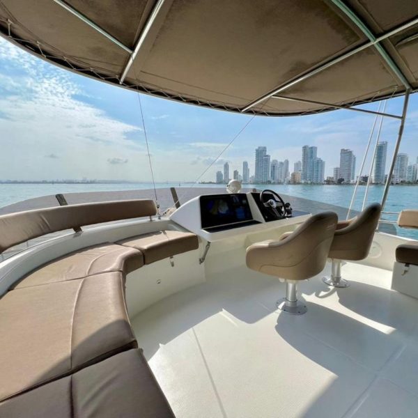 Flybridge y áreas lounge: Disfruta de la vista panorámica, broncea bajo el sol o relájate con la brisa marina.
